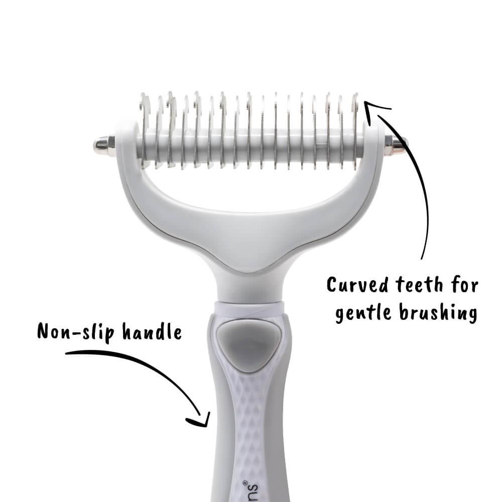 For sensitive skin, our All Pet Solutions Round Slicker Brush is a perfect choice. This brush is gentler than a cat comb and teases out tangles gently without pulling or ripping at the fur. A non-slip handle is essential to making this task simple and enjoyable for both you and your pet!