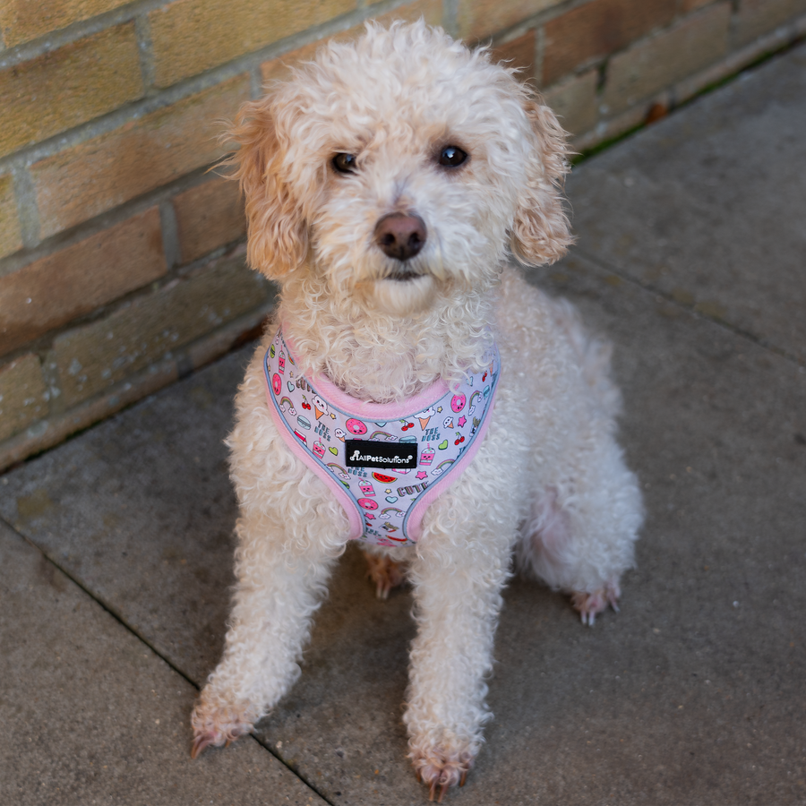 Show off your furry friend’s stylish side with the All Pet Solutions Grey Doughnuts print dog harness. Featuring a bright and bold printed pattern with macarons, doughnuts and all things sweet! Designed to minimise strain on your dog and reduce pulling whilst on the lead. It has a strong, wipeable fabric on the outside and a soft, breathable air mesh fabric on the inside. This makes it much more comfortable for your dog to wear than a standard harness, and its reflective edging provides added visibility and safety for your dog.